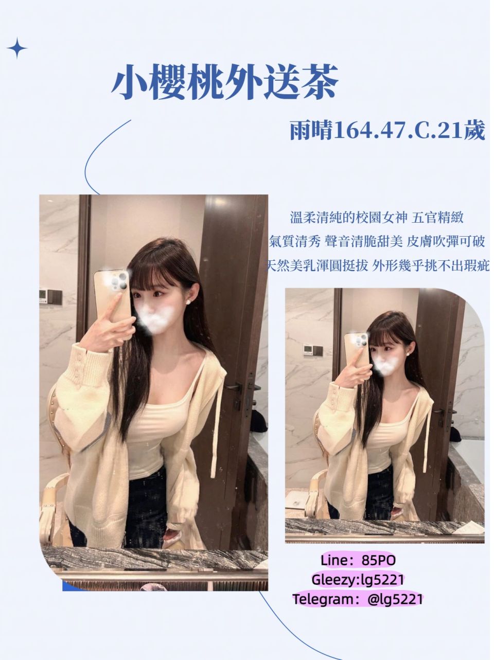 小奶音158.44.C.19歲 今日是第一次 乖巧型 不愛多說話 行為青澀 初戀感爆棚 接受舌吻品鮑 Line:85PO Gleezy:lg5221 Telegram:@lg5221
